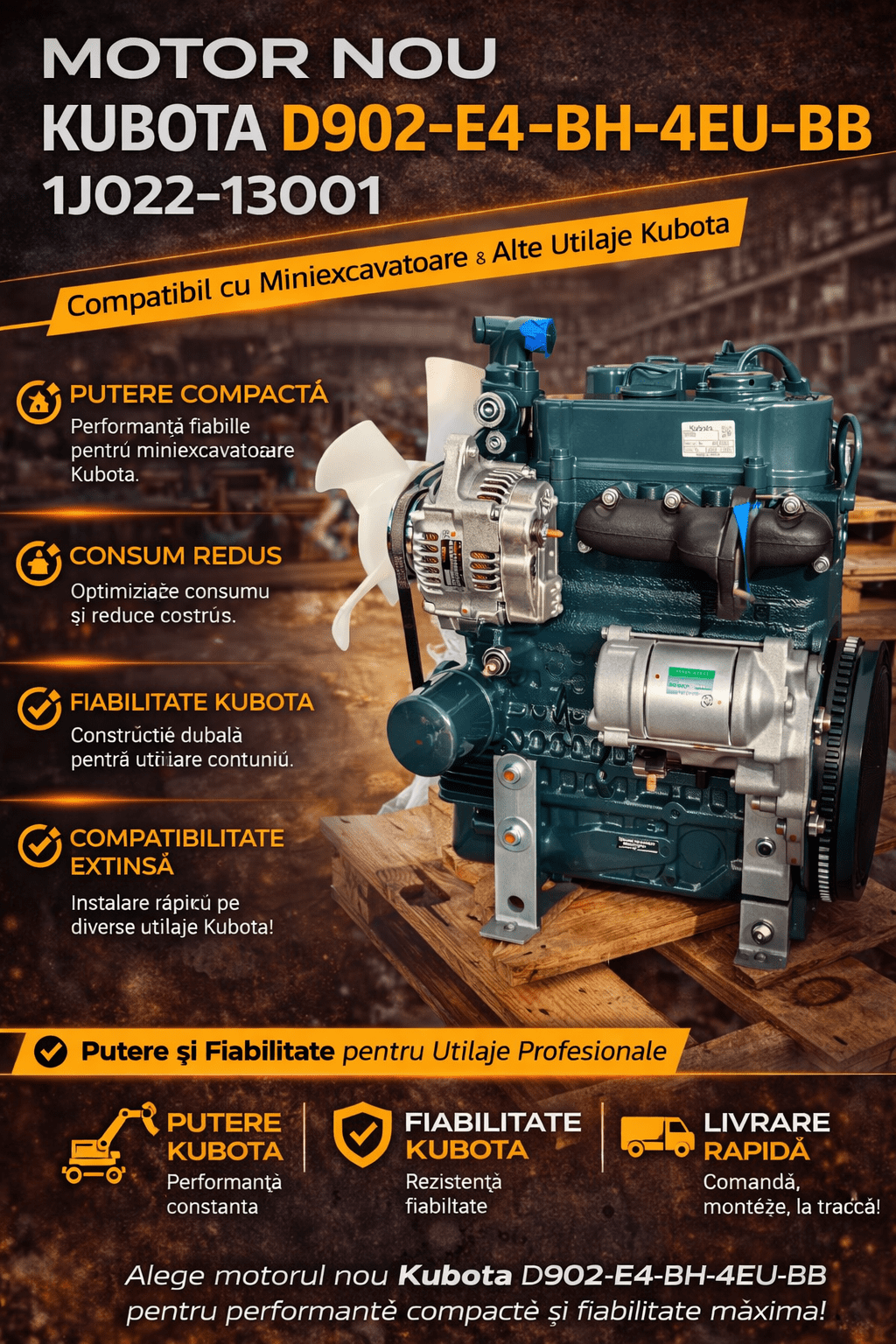 Motorul nou Kubota D902-E4-BH-4EU-BB 1J022-13001 este soluția ideală pentru utilaje compacte profesionale. Este proiectat pentru miniexcavatoare Kubota și echipamente compatibile. Oferă performanță constantă și eficiență maximă în exploatare.