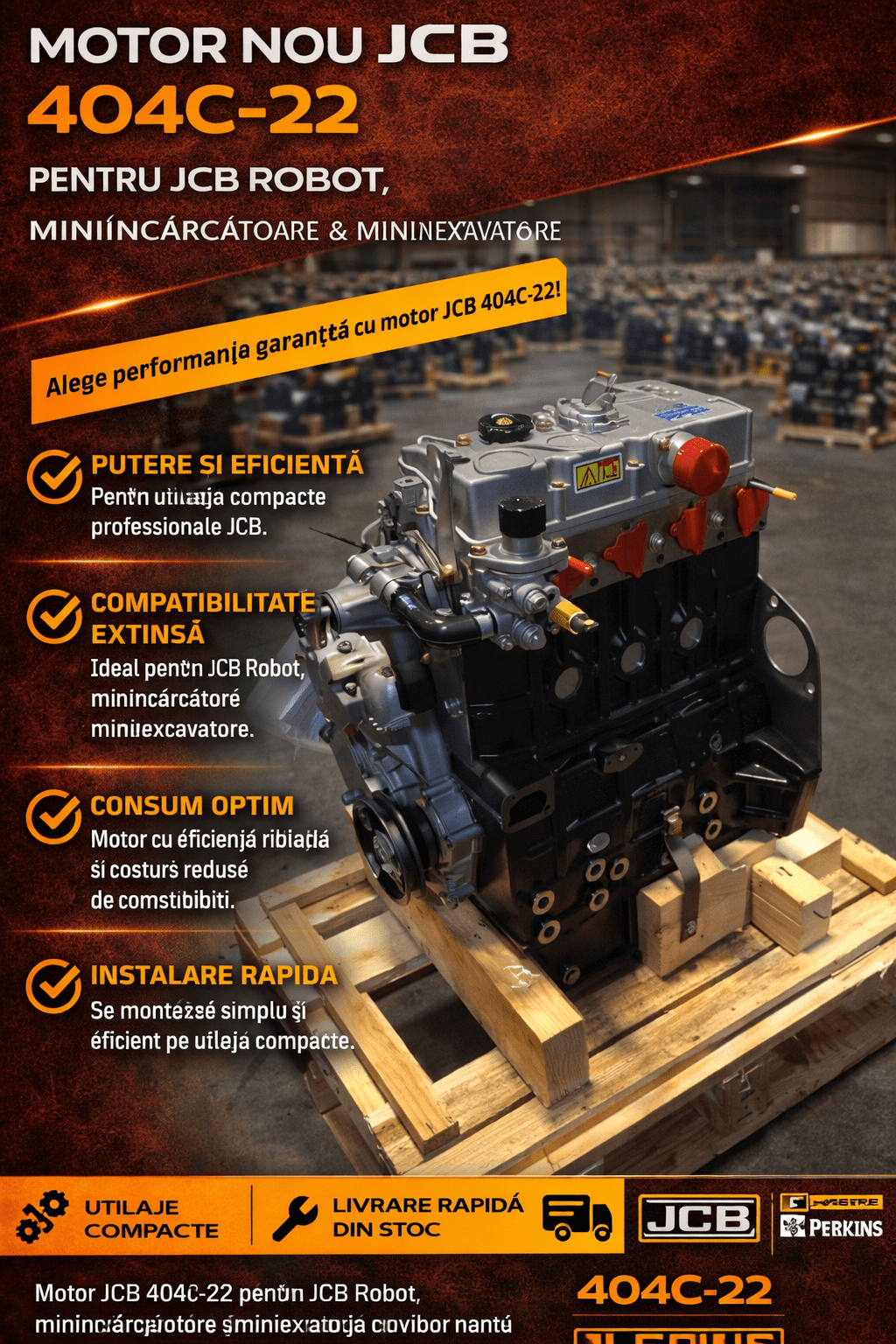 Motor nou JCB 404C-22 este soluția ideală pentru utilaje compacte profesionale. Este compatibil cu JCB Robot, miniîncărcătoare și miniexcavatoare moderne. Acest motor oferă performanță constantă și eficiență ridicată în exploatare zilnică.