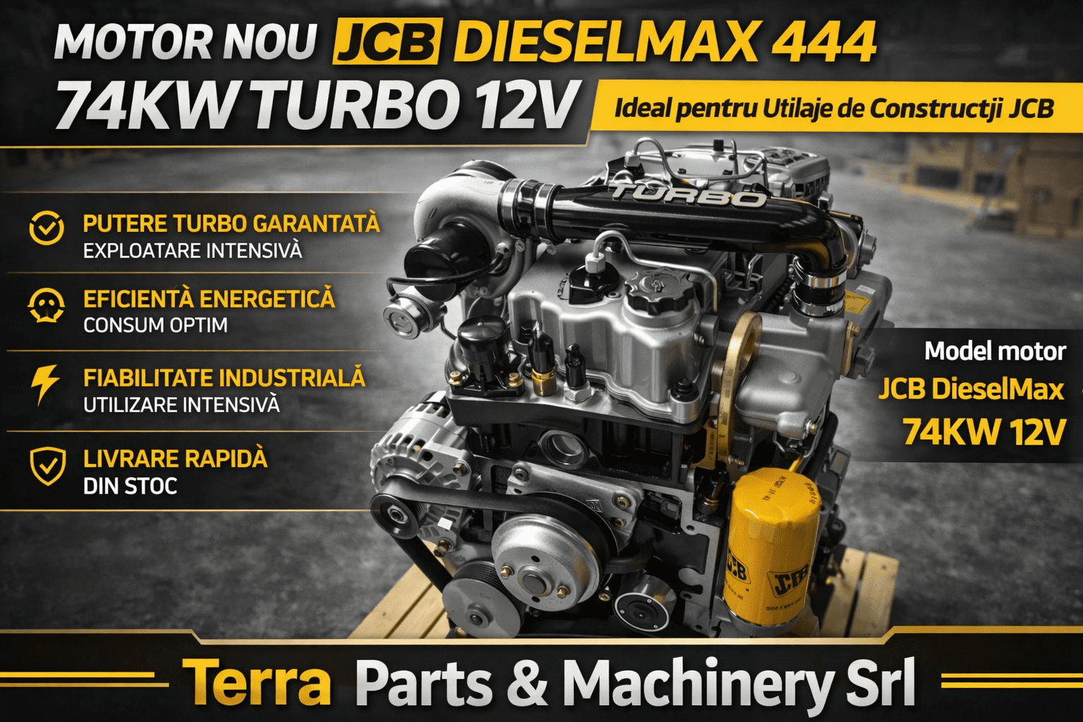 Motorul nou JCB DieselMax 444 74KW Turbo 12V oferă performanță superioară pentru utilaje de construcții JCB.