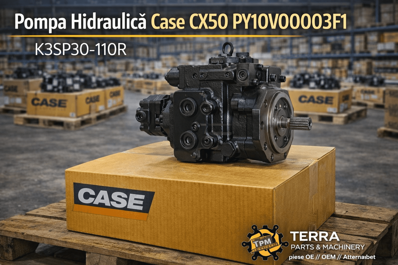Pompa hidraulică pentru excavator Case CX50, cod K3SP30-110R / PY10V00003F1, oferă performanță constantă în exploatare. Este componenta esențială pentru funcționarea sistemului hidraulic.
