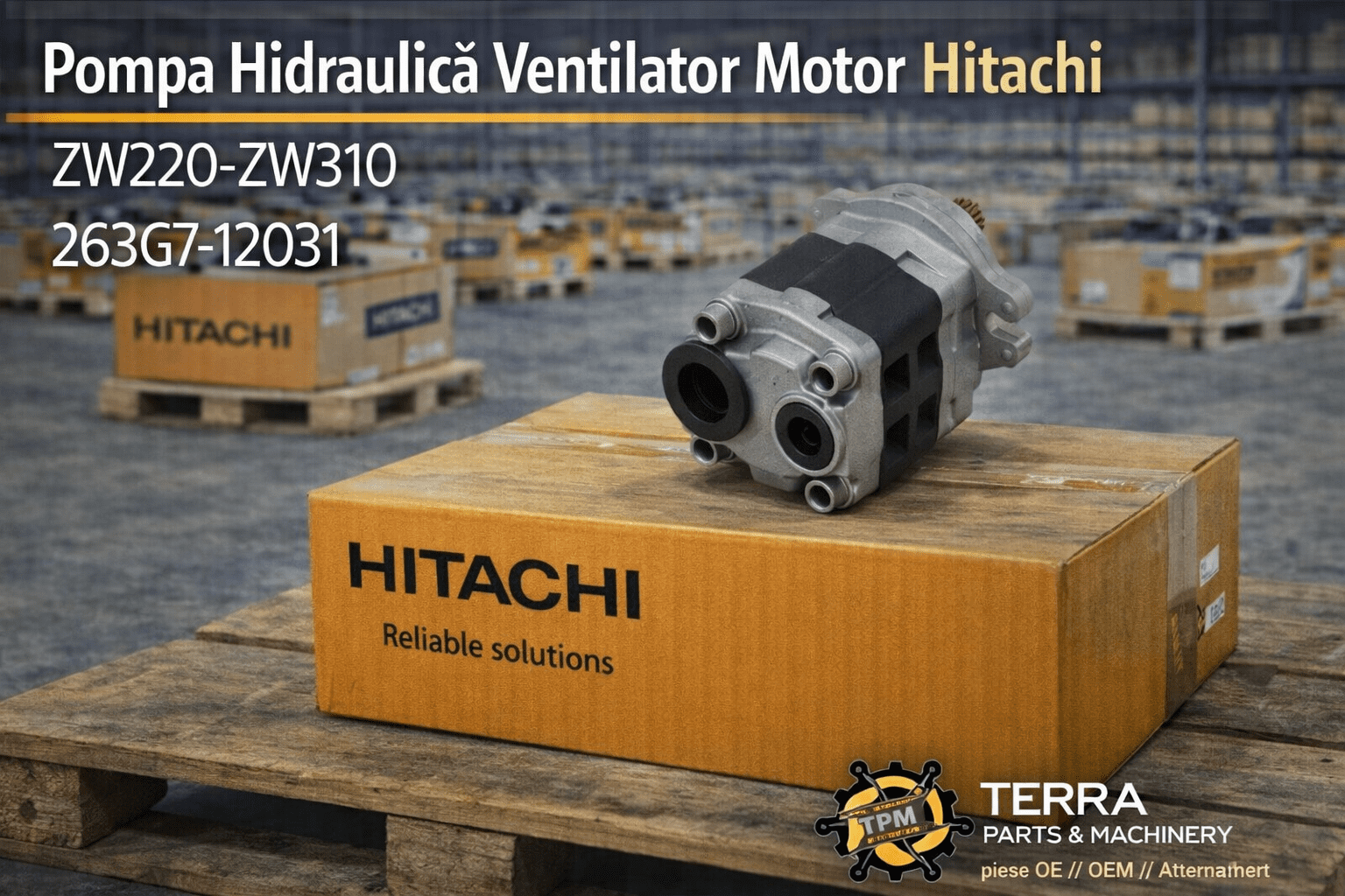 Pompa hidraulică pentru ventilator motor Hitachi, cod 263G7-12031, asigură răcire eficientă în exploatare intensă. Este proiectată pentru încărcătoare Hitachi ZW220, ZW250 și ZW310.