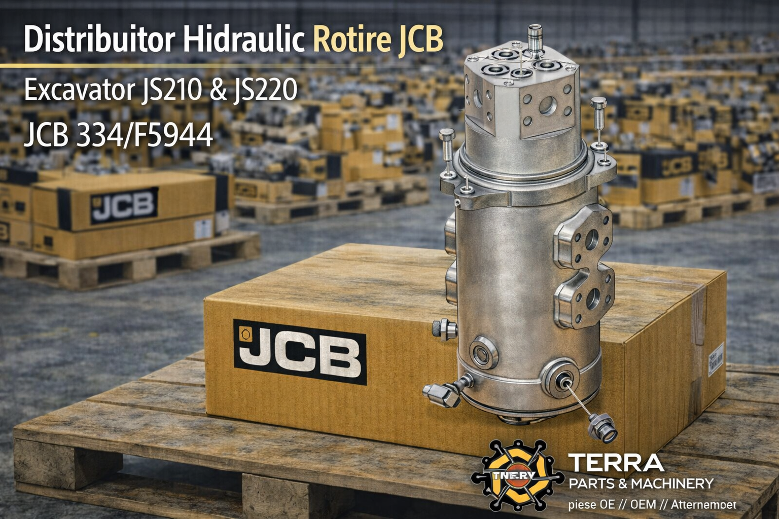Distribuitorul hidraulic de rotire tip rotary coupling JCB, cod 334/F5944, oferă performanță excelentă în exploatare intensă. Este proiectat pentru excavatoare JCB JS210 și JS220.