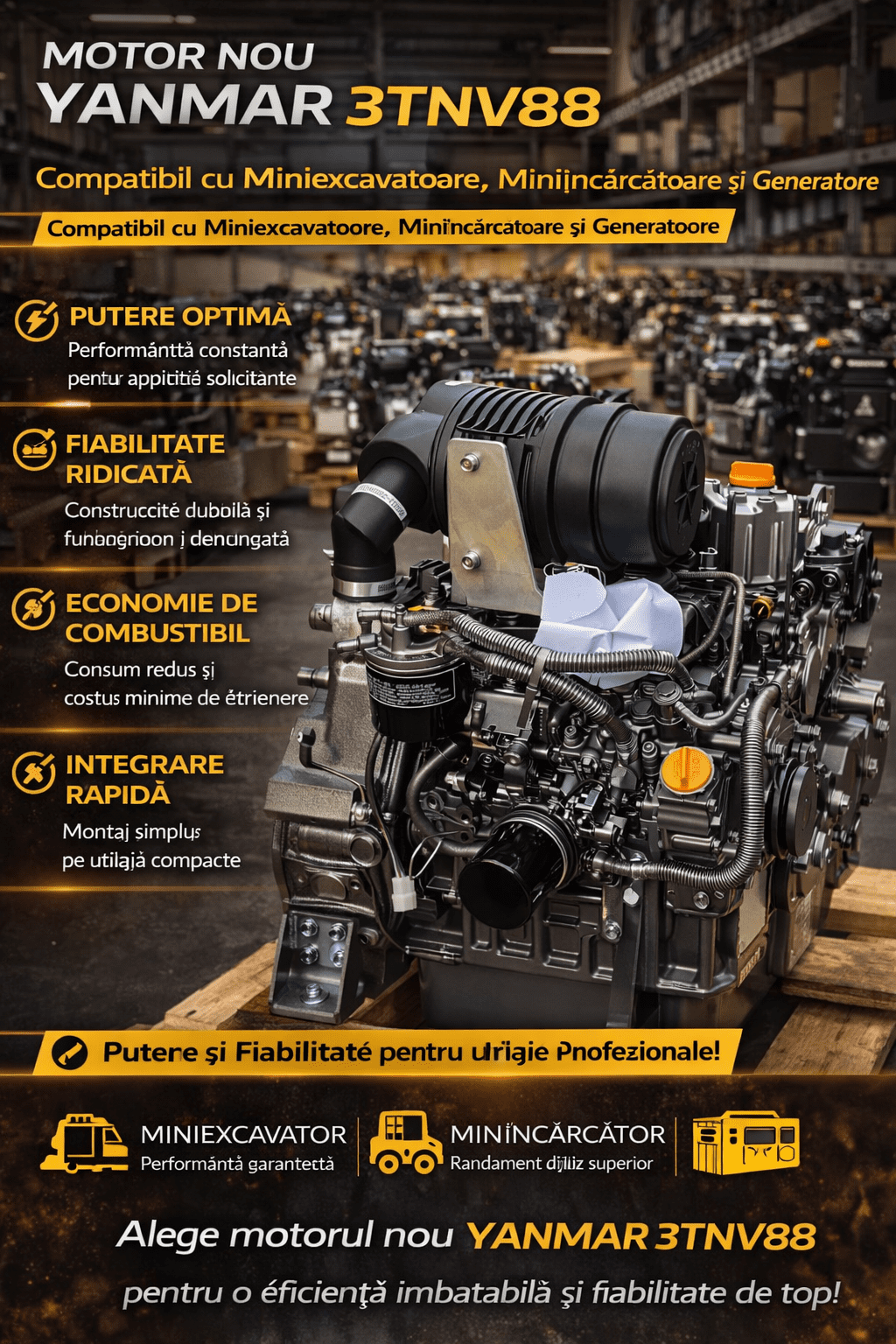 Motorul nou YANMAR 3TNV88 oferă putere constantă și eficiență ridicată pentru aplicații profesionale intensive. Este proiectat pentru utilaje compacte moderne.